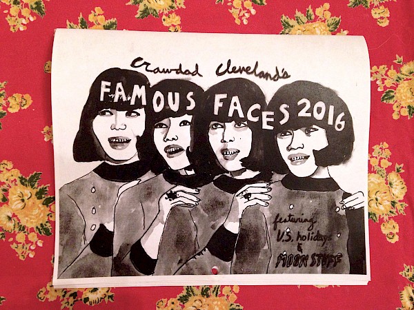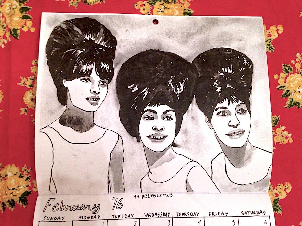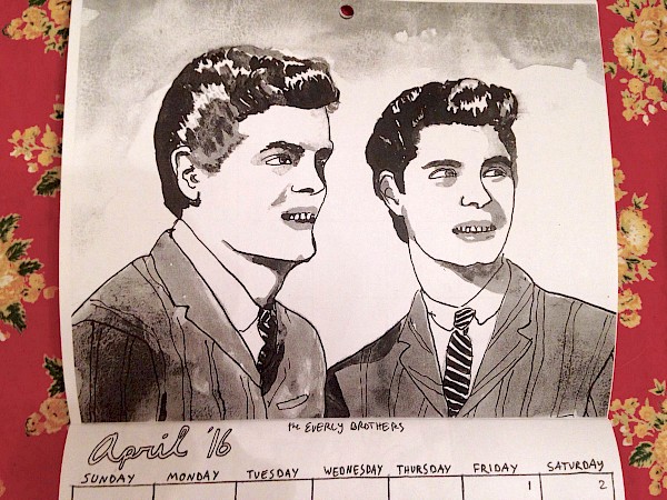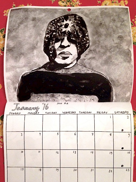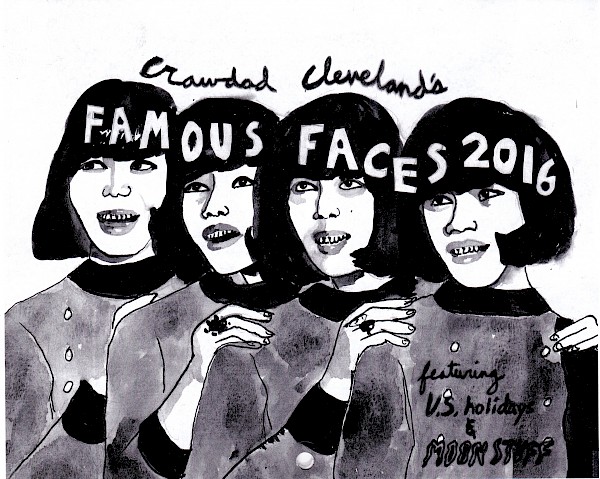 Painted by Seattle's own Crawdad Cleveland, a famous face you might know from such groups as La Luz and The Curious Mystery. Black & white, hole-punched. With major holidays, phases of the moon, and a page for notes. 8.5" x 14" when unfolded.