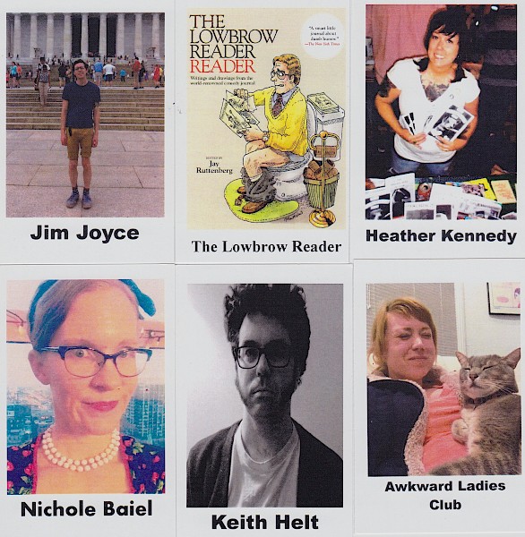 The third round of zinester trading cards! Each pack is randomly assorted with nine full-color cards and a sticker of another card. Front of the card shows the person or place, back of the card gives the stats.