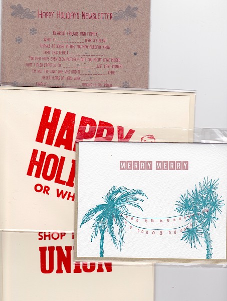 Four letterpressed holiday cards. Two from New Orleans printer/zinester Hope Amico and two from Olympia printer/zinester Kelsey Smith. All for $10.