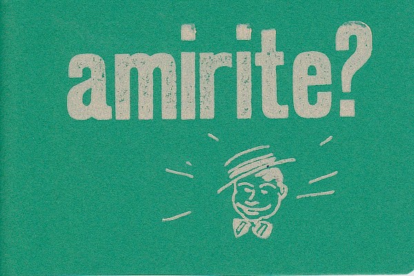 Amirite is a handsome, well-organized guide to life's humorous annoyances. Or it's an elaborate joke about jokes. Or maybe it's an epic poem where every line ends with "amirite." Commentary from a variety of Olympia luminaries builds this into whatever it is.