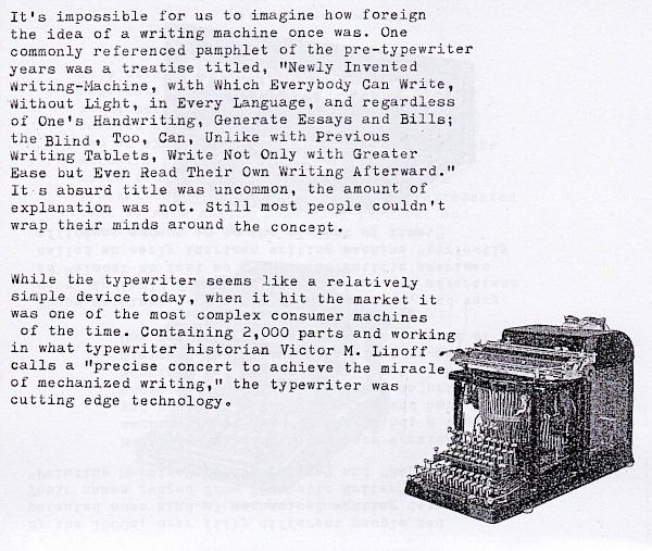 A historical and personal exploration of how the typewriter changed the world, in a variety of (often contradictory) ways. Typewriter stories, early writing machines, gender and the typewriter, the commodification of nostalgia, typewriter quotes, old typewriter photos, so much more.