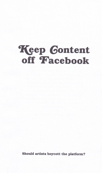 As he so wisely writes in the introduction, Keep Content Off Facebook hopes to give "creative communities a starting point for more closely examining their relationship with Facebook. We are not powerless to change this relationship. As creatives, we hold more power than we realize because our labor is one of the primary engines upon which the Facebook machine is built."