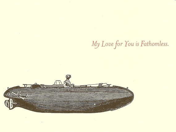 A beautifully letterpressed card to express your adoration. The inside image is of a submarine with the submariner in it and says, “My Love for You is Fathomless."