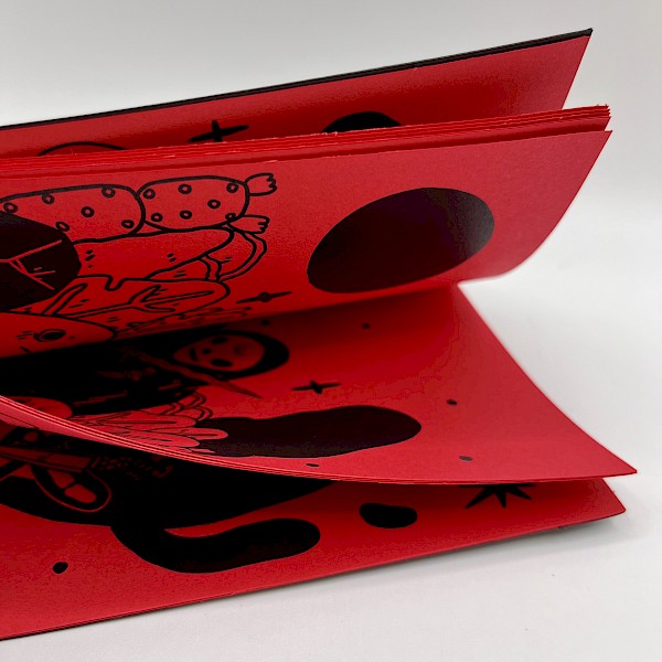 24 pages, quarter size. Black ink on black cover (spooky) and red interior pages.