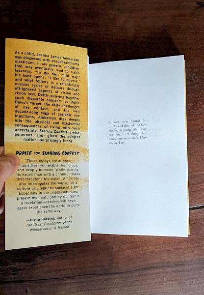 From the publisher: "As a child, Joshua James Amberson was diagnosed with pseudoxanthoma elasticum, a rare genetic condition that may eventually lead to sightlessness. 'In my own mild way,' his book opens, 'I like to obsess,' and what follows is a relentlessly curious series of detours through oft-ignored aspects of vision and vision loss. Deftly weaving together such disparate subjects as Bette Davis’s career, the daily challenges of eye contact, and his own decade-long saga of periodic eye injections, Amberson digs deeply into the physical and existential consequences of living with such uncertainty. Staring Contest is wise, generous, and—given the subject matter—surprisingly funny."