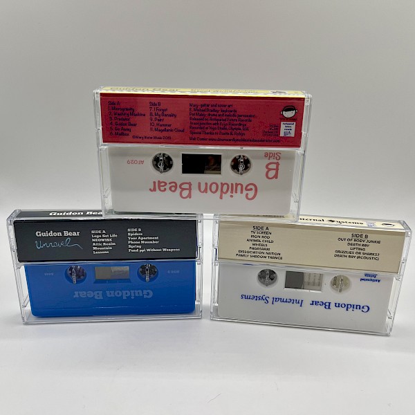 All three albums from great Olympia off-kilter indie-pop band Guidon Bear. 2024's Internal Systems, 2022's Unravel, and their 2019 debut Downwardly Mobile: Steel Accelerator, all on beautiful cassette tapes.