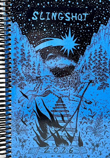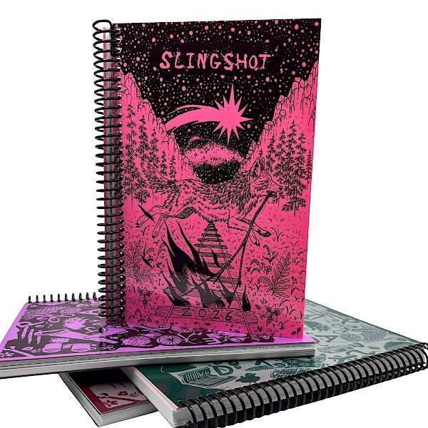 The large, spiral-bound Slingshot Organizer for 2026, a staple of DIY and radical communities for 30 years! As always, it's scrappy, fun, educational, and a tactile goodness in a digital world.