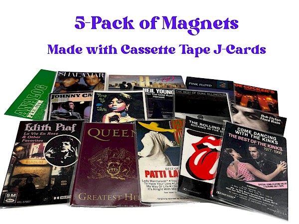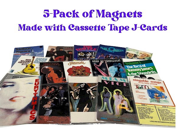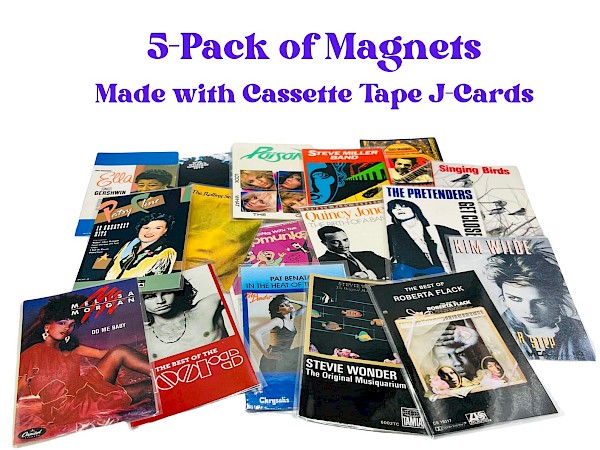 A grab bag of 5 magnets made from cassette tape cover art (J-cards). Each magnet's J-card is from a nonfunctional vintage cassette tape, hand-laminated to preserve the cool retro art.