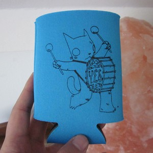 A drummer cat beer koozie with a marching band drum that says, "Rad."