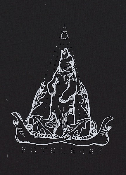 A grizzly bear getting ready to swallow the moon, amongst oak leaves and the jawbone of a deer.