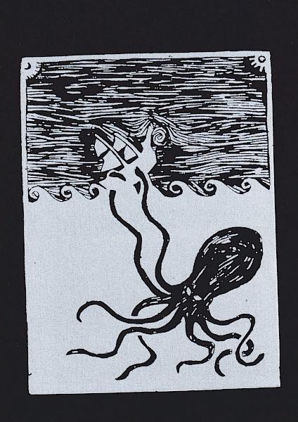 From the depths. A mythological sea battle, on a patch.