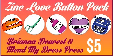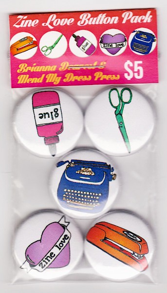 Five one inch buttons to show off your zine love. Represented within: Typewriter, glue, scissors, stapler, and zine heart tattoo. Ridiculously cute. Drawings by Bri Dearest of Motor City Kitty.