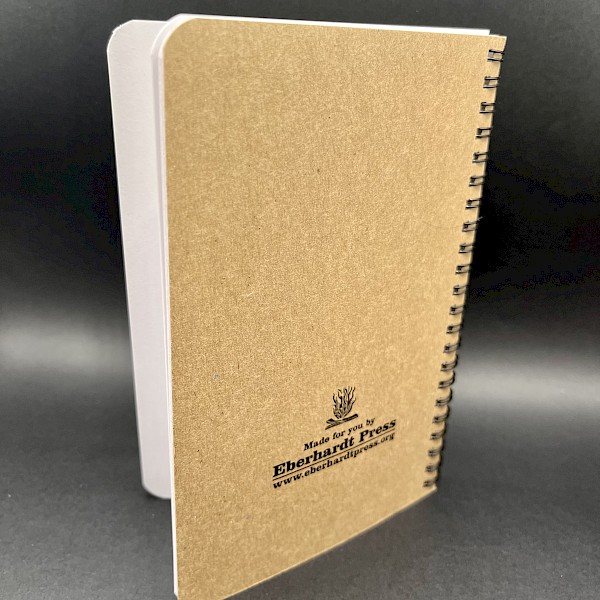 120 pages (60 sheets), 5" x 7". On 32pt chipboard, recycled and reused paper inside. Offset print, spiralbound, unlined book.