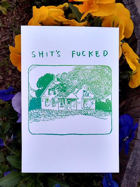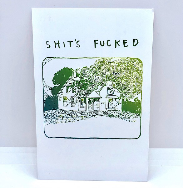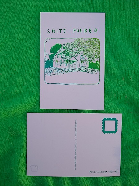 A postcard version of Gina Sarti's now-classic zine, Shit's Fucked: A Positivity Guide.
