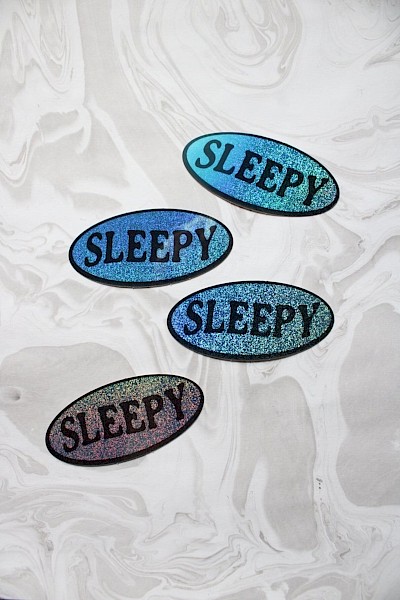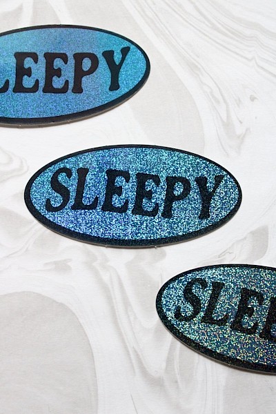 2.5" wide x 1.2" tall, waterproof, oval blue-glitter sticker with black text and border.