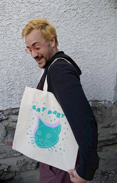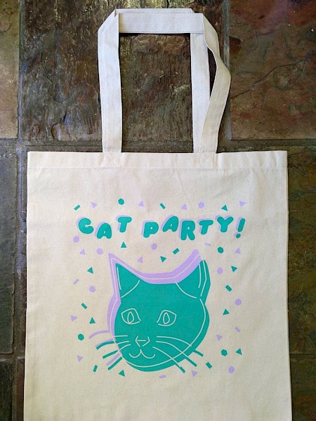 The excitement of a party with cats. On a tote. Designed by Katie Haegele of Cat Party zine and Joseph Carlough of Displaced Snail Publications.