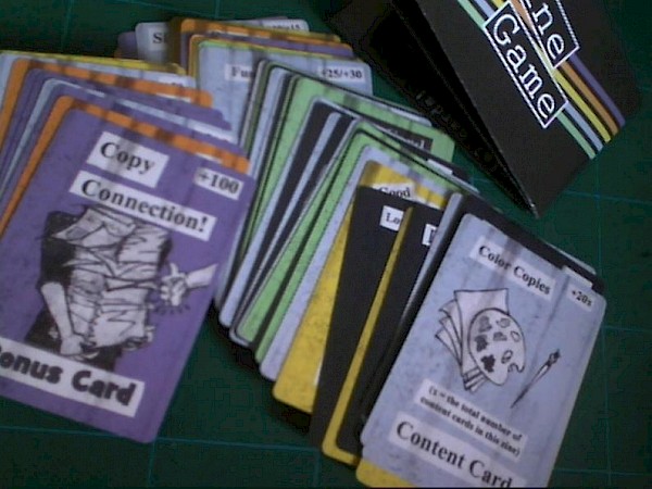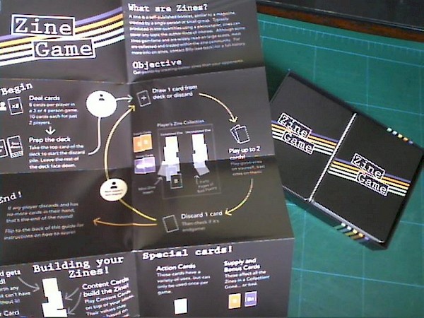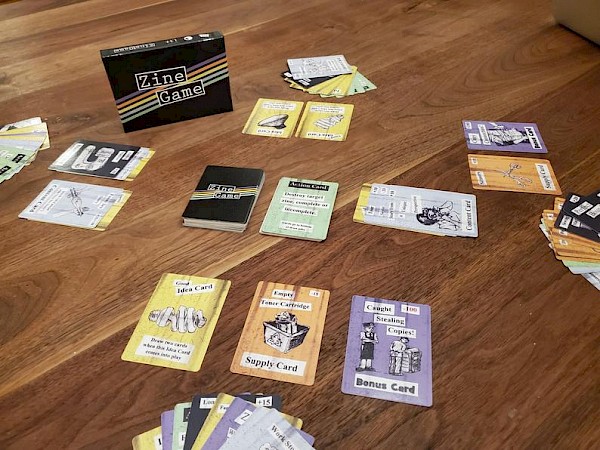 A long-time favorite in the zine community, now in a fancy, professionally-made version accessible to all game lovers. Playing like a cross between canasta and Magic: The GatheringZine Game is all about building your own zines. A 70-card deck where players use Content Cards, Action Cards, Idea Cards, Supply Cards, and Binder Cards to create zines, sabotage other players zines and compete for the most points.