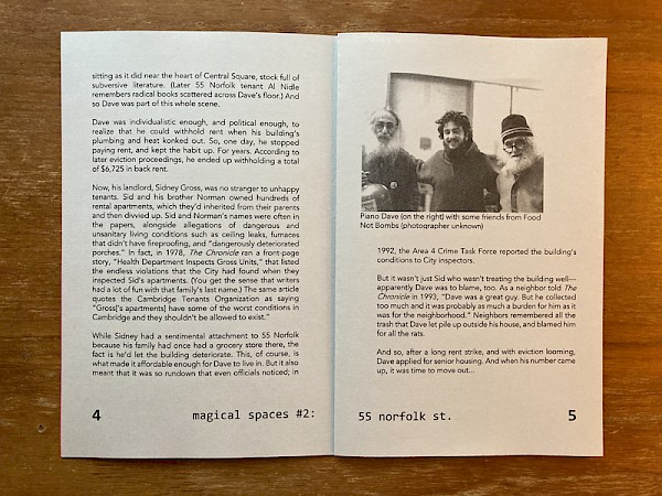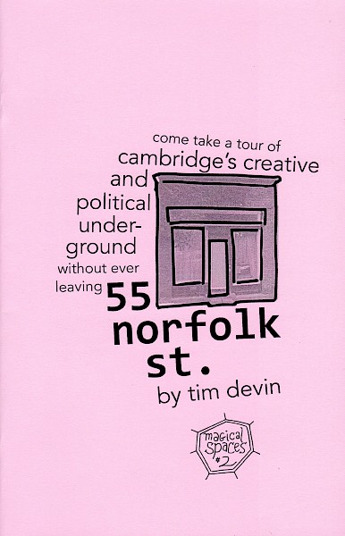 From Tim Devin's Magical Spaces series, 55 Norfolk St. looks at the magical past of one shopfront in Cambridge, Massachusetts. What was a small grocery store for the first half of the 20th century became a home for arts collectives, tenants' rights organizations, performances spaces, independent galleries, and a politically-radical player-piano-busker known as Piano Dave. It's been called the Mobius Artists Group, Eviction Free Zone, Meme, 55 Norfolk, among other names, and this zine records all of those histories.