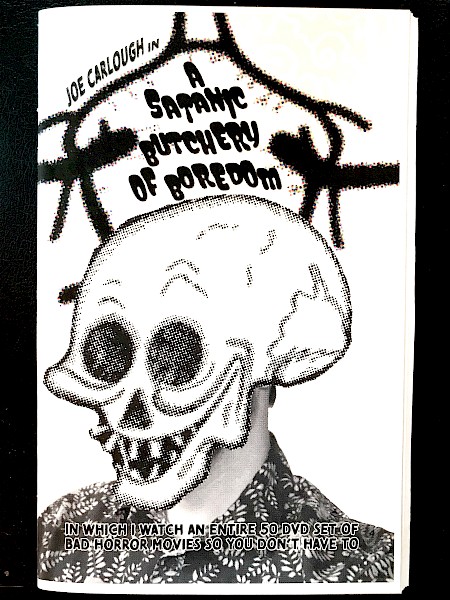 Ever-prolific zinester Joe Carlough goes all in for his latest, A Satanic Butchery of Boredom: 50 reviews from his dive into a low-budget B-horror DVD box set. The worst of the worst meets campy midnight movies, stylized gems, punk slasher flicks, and some things that aren't even horror.