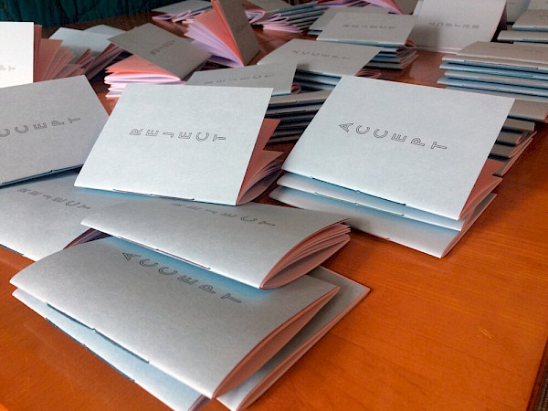 Hand-sewn and hand-numbered. 44 pages, quarter-size.