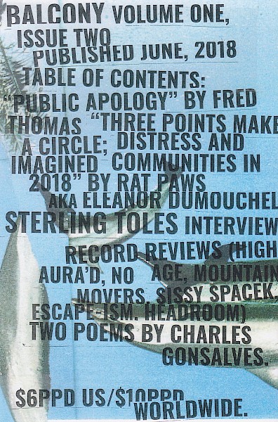 In this issue of Balcony there's a public apology, an essay about Lewis Hyde's The Gift, an interview with left-field hip-hop musician Sterling Toles, in-depth record reviews, and a couple poems by Charles Gonsalves. But as in every issue of Balcony, it's also much more than that. A surprising, quietly exceptional zine.