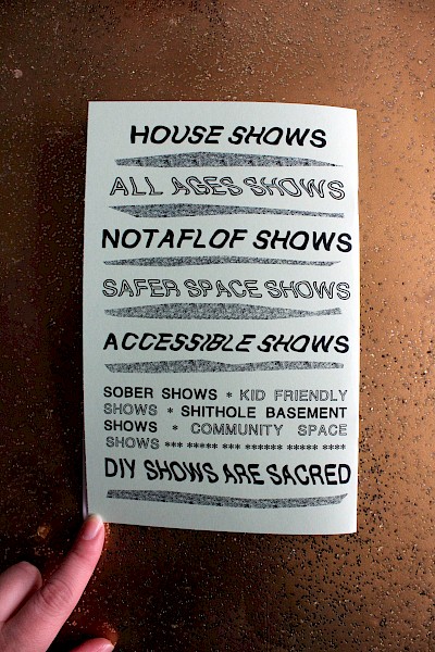 As it says on the first page: "This zine is a love letter to the basements and community spaces that felt like home. The songs that lived on mix tapes and CDs in our headphones and in our hearts, right up until the moment we got to yell the words in person, with a bunch of smiling strangers. This zine is dedicated to the bands and crowds that made us feel less alone. a nod to some of the best nights of our lives. This zine is for you."