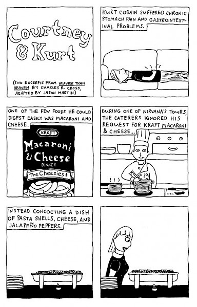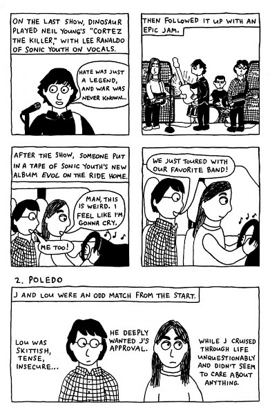 A highly enjoyable series of comics adapted from music biographies. Within: Bob Dylan's makeshift Blood on the Tracks backing band, Kurt & Courtney's mac-and-cheese trials, John & Yoko's primal scream therapy, John Coltrane being a good guy, Mike Watt wearing a pumpkin on his head, the feuds of J Mascis & Lou Barlow, and Kristin Hersh's evil self.