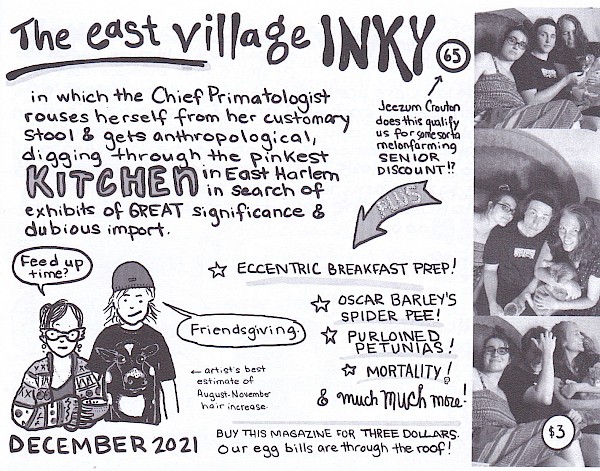 Founded on the premise that "even the most mundane details are pretty entertaining if you come at 'em from an intentionally cockeyed angle & spend enough time down the rabbit hole," The East Village Inky is cashing in on its senior discount for this, its 65th issue. And this is perhaps the perfect embodiment of that founding premise, with a kitchen theme that's more about the oddities adorning the kitchen than the food the room gives home to.