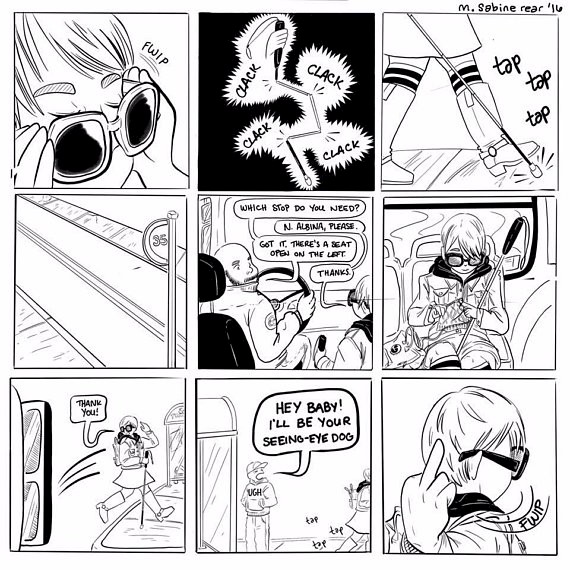 Empathy Exercise places the classroom exercise of putting a blindfold on to imagine being blind against the daily reality of being blind. Through M. Sabine Rear's stunning comic panels, the juxtaposition points out both the limitations of the exercise and the false narratives it perpetuates.