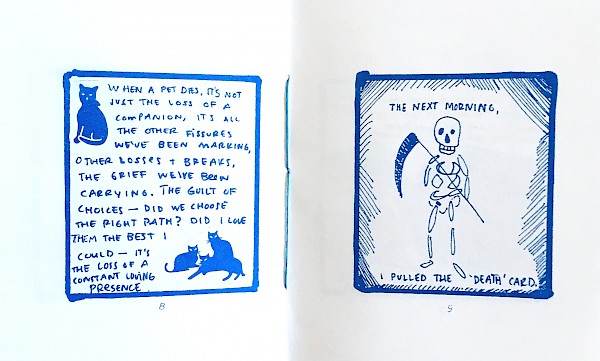 A gorgeous little zine dedicated to friends dealing with grief and to a late great cat. Words and images in tribute, in support, in mourning.