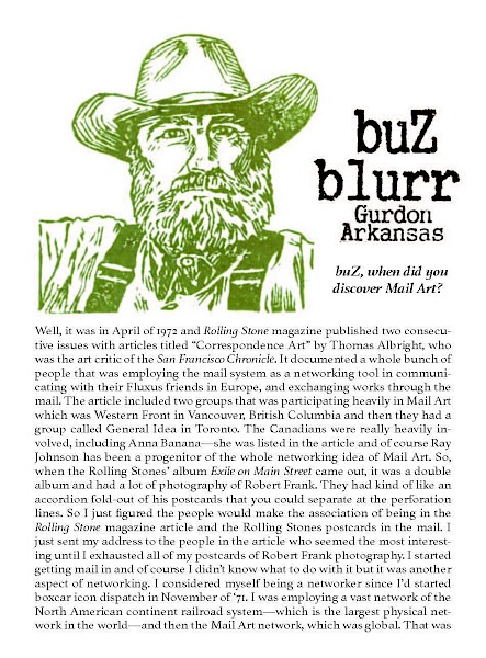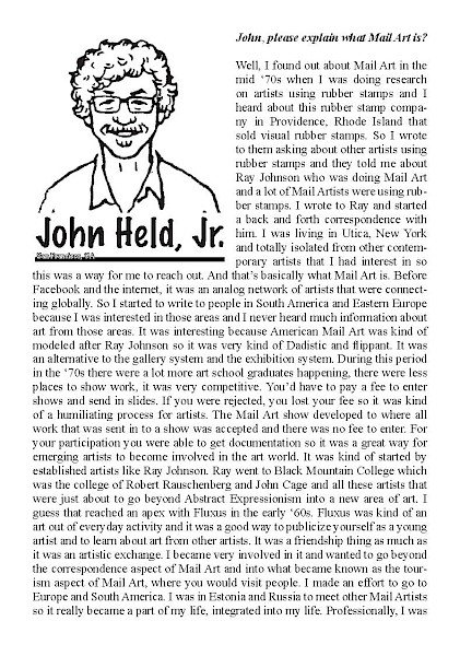 Editor Matthew Thompson traveled far and wide for interviews with: buZ blurr; John Held, Jr; Anna Banana; Leslie Caldera; EF Higgins III; Ryosuke Cohen; Noriko Shimizu; Henry Denander; and Chuck from the post office. Plus a bonus 1977 interview with the father of mail art, Ray Johnson! Holy cow.