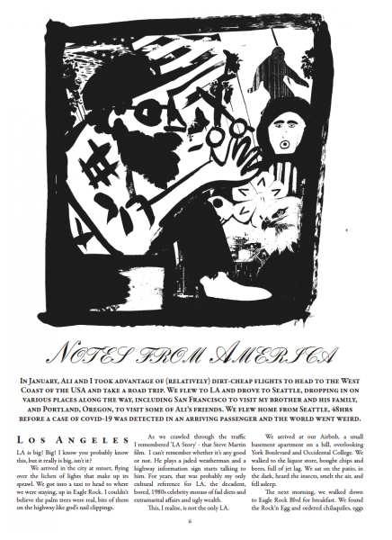We always love Minor Leagues, U.K. comic artist/graphic memoirist Simon Moreton's ongoing zine series. Dreamy fluid comic art, solid prose, collaged bits and pieces, a fun variety show of a zine. In this issue: notes from America, birdwatching, topographies, wallpaper, foxes, home.
