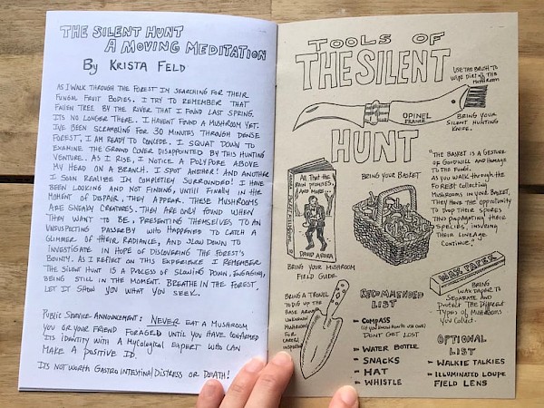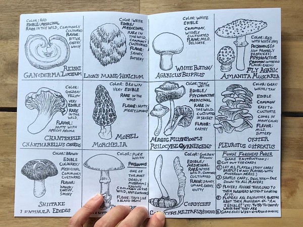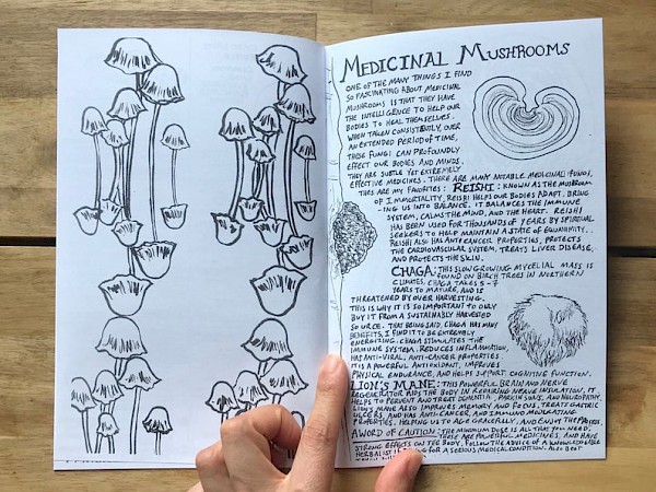 In this fungi-focused zine: medicinal mushrooms, mushroom tea, mushroom hunting, psilocybin, cordyceps, the mycelial web, and a really handy and lovely center spread of common mushrooms.