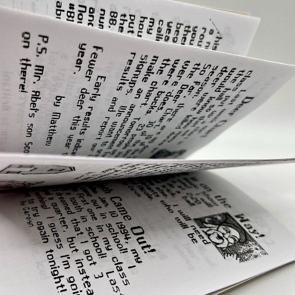 Comprised of actual articles from an early '90s elementary school newspaper, this zine is a strange, hilarious, and sometimes bafflingly tender time capsule.