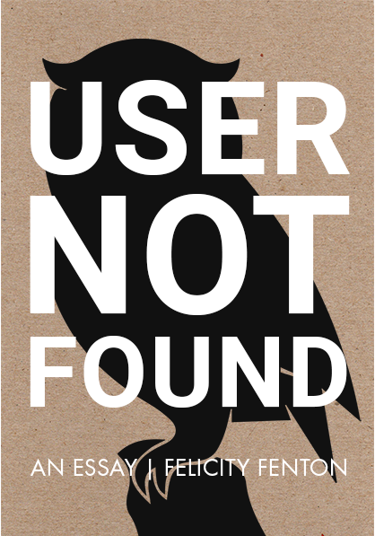 "Prompted by a sequence of discouraging internet encounters, Felicity Fenton attempts to free herself from the tendrils of an online world we know, but struggle to look away from. She evaluates the endless distractions of being tethered to her device and all that comes with it: email, spam, texting, taking pictures, and social media (aka 'the walls'). In lyrical prose that swerves into dream-like mirage, hilarious thoughts, social observations, and unwavering sadness, User Not Found is a powerful essay that is all too relatable."