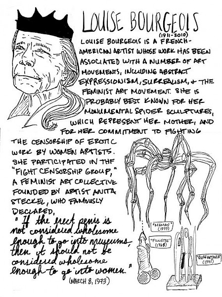 Within: Louise Bourgeois, Carrie Mae Weems, Eva Hesse, Yoko Ono, Ana Mendieta, Alice Neel, Hannah Wilke, Rosa Bonheur, Méret Oppenheim, Gabriele Münter, Mary Kelly, Rokudenashiko, Hannah Höch, Shirin Neshat, Lee Krasner, Catherine Opie, Louise Nevelson, Orlan, Lorna Simpson, Andrea Fraser, Helen Frankenthaler, Nan Goldin, Vaginal Creme Davis, and the Guerilla Girls.